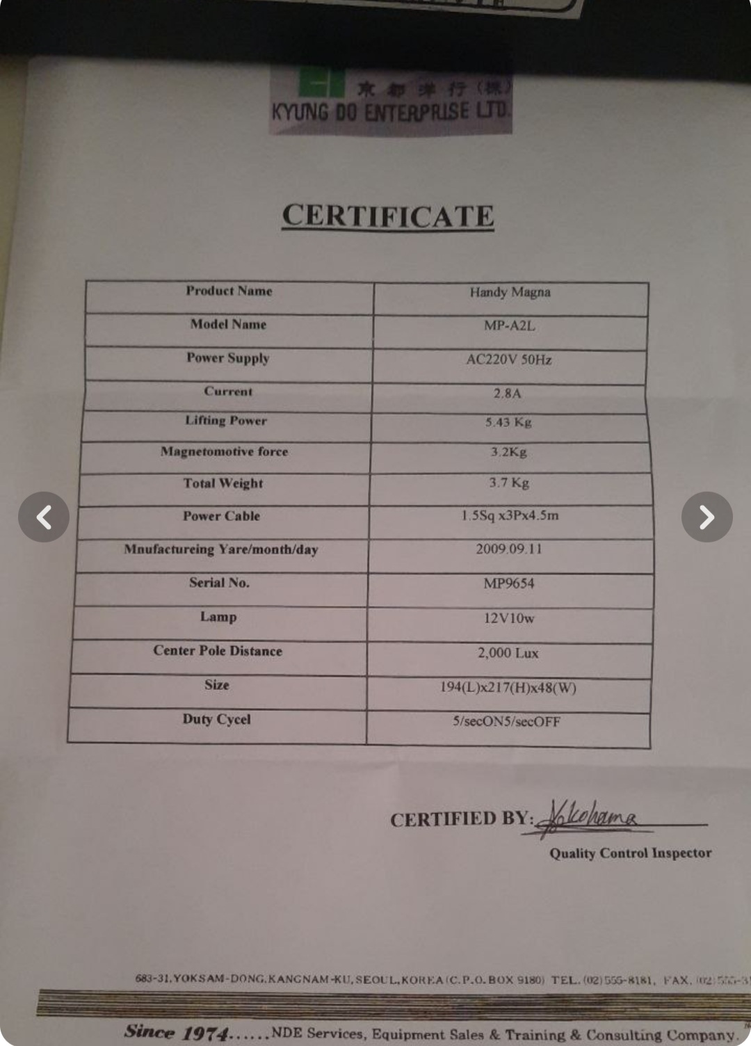 دستگاه یوک مغناطیسی یا تست جوش KDE HANDYMAGNA ساخت کره جنوبی اصلی جهت بازرسی جوش(عمق و ترک و....) یک دستگاه فوق العاده عالی و با کیفیت و مگنت قوی شناسنامه کار بازرسان جوش همراه جعبه و... آماده به کار در حد نو(استوک)