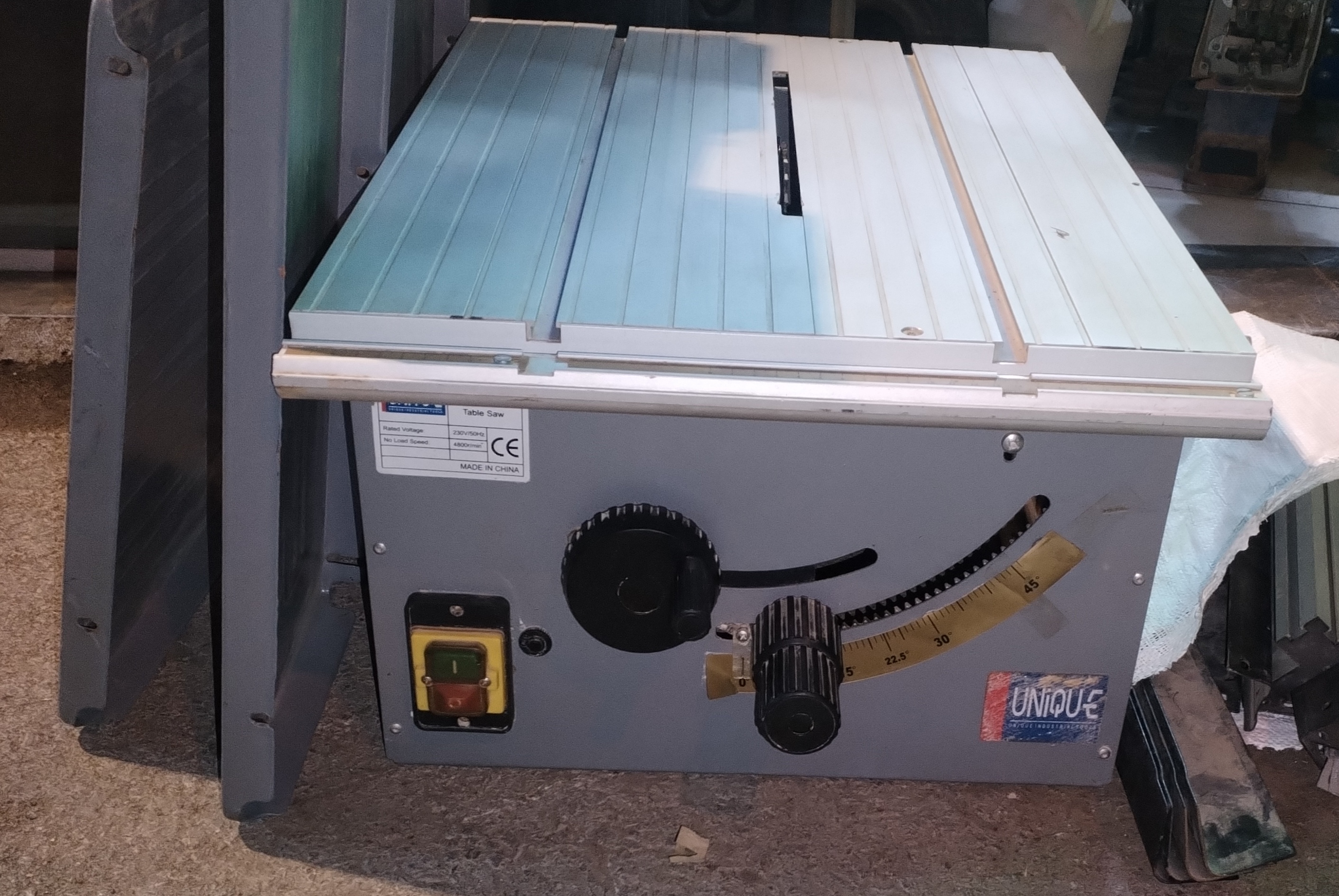 اره میزی 4800 دور یونیک سری قدیم ساخت(PRC) همراه قرار دو کله و میز 3 تکه که ابعاد میز برش را حدود 2/5 برابر میکند قابلیت تنظیم زاویه تیغ و ارتفاع تیغ و یک عدد تیغه برش اصلی دندانه درشت تمام فابریک و آماده به کار(استوک)