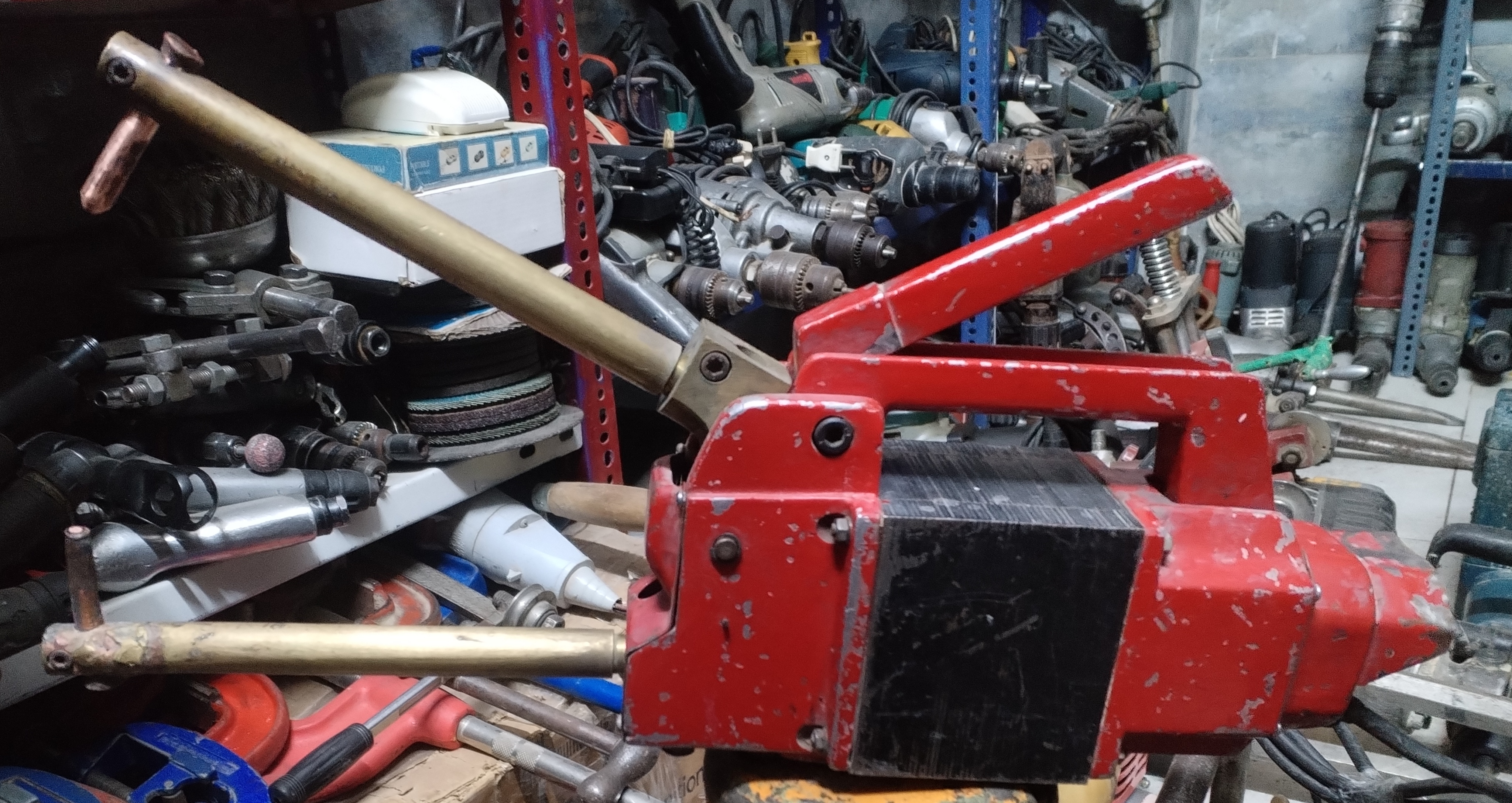 دستگاه نقطه جوش دستی پرتابل با بازوهای تمام برنجی توپر قدیمی مدل G. E. M اصلی ساخت تبریز بسیار با کیفیت و عالی دارای 5 درجه تنظیم قدرت و فرکانس سالم و فابریک و آماده به کار مناسب مصارف سنگین و دائم کار(استوک)